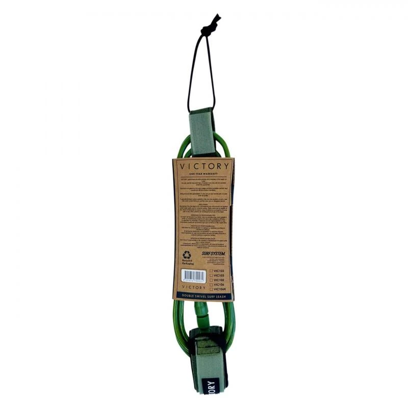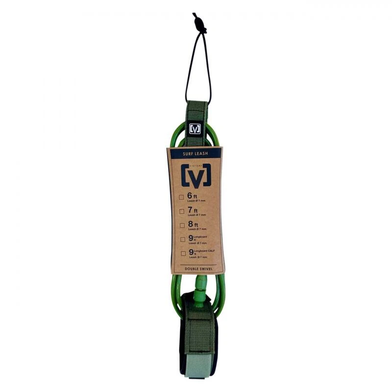VICTORY – Surf Leash Regular 8′ – Mat Green • Urethane 7mm haute qualité • Nouveau stainless steel ‘swivels’ (emerillons) aux 2 extremités • Rail saver détachable avec poche à clé. • Ficelle Custom